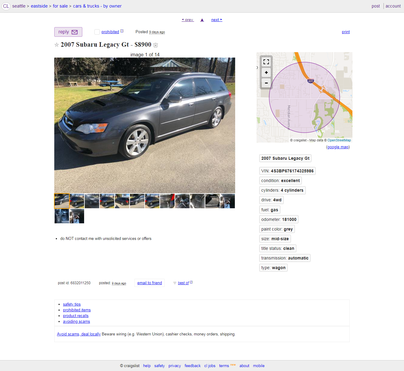 If you compare prices for a Subaru here in the Seattle-Tacoma area and say Phoenix or even Los Angeles, you’ll find that there is a price difference of $1,500-$2,500 for the same exact car. When it came time to start actively looking for a fourth generation Subaru Legacy GT wagon, there were none locally. There were none in Portland. I broadened my search and there were none in Spokane or Boise or Bend. There were none between here and the Bay Area. The ones that I found in the Bay Area appeared to be used and abused. No thank you. As I broadened my search to a 1,200 mile radius, only one showed up that was in the Sweet Spot.