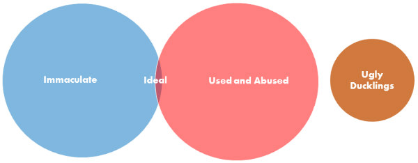 The Ugly Ducklings include the Atlantic Blue, Brilliant Red, and Dark/Newport Blue colored cars or anything with a tan interior. These are non-starters for me.